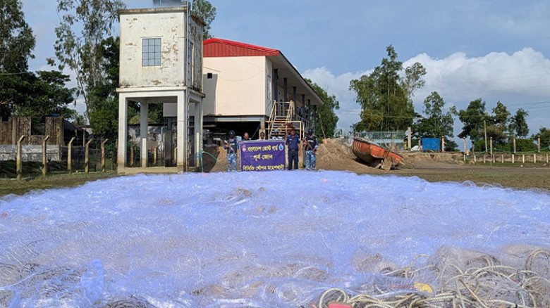 কক্সবাজারে কোস্ট গার্ড ও মৎস্য অধিদপ্তরের যৌথ অভিযানে ৭৫ কোটি টাকা মূল্যের ৫০ লাখ মিটার অবৈধ কারেন্ট জাল জব্দ করা হয়েছে।